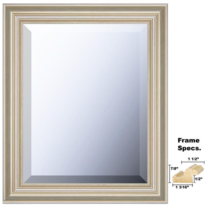 This 1 1/2" wide frame is made from real wood and features a elegant silver finish with a decorative inside edge. Frame also has a reverse swan slope. The mirror can use a 1/8" thick flat glass or a 1/4" thick beveled glass. Many have been compelled by the higher quality, clear look the beveled glass creates.