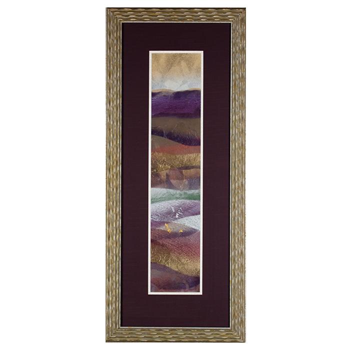 Description: Original mixed media framed in a 1 5/8" wide wave gold and silver wood frame with U.V. filtering glass and a double mat with a silk top mat. Designed to hang with other piece in set.