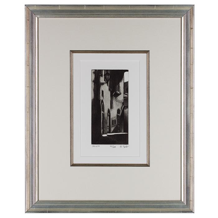 Description: Limited edition etching framed in a 1 1/8" wide silver wood frame with U.V. filtering glass and a double acid free mat with a silver fillet on the top mat.