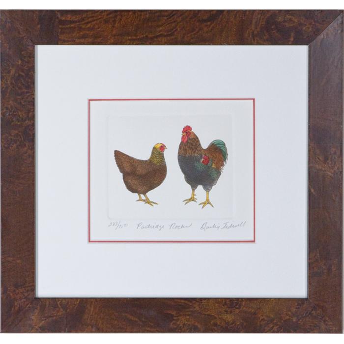 Description: Limited edition 283/750 hand colored etching. Art is framed in a 1 1/8" wide burl grained wood frame. Frame also includes U.V. filtering glass and a double acid free mat.