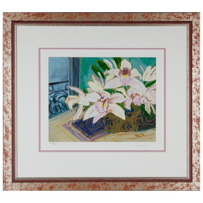 Description: Limited edition serigraph framed in a 1 3/4" wide speckled pink and silver wood frame with regular glass and an acid free double mat.