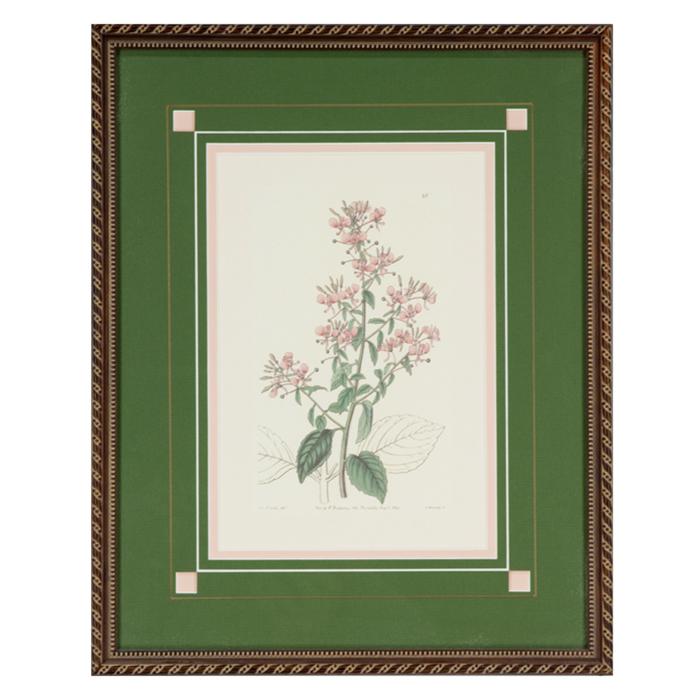 Reproduction print in 5/8" wide beaded, roped chestnut frame with regular glass and a double mat with corner cutouts, french line and V-groove.