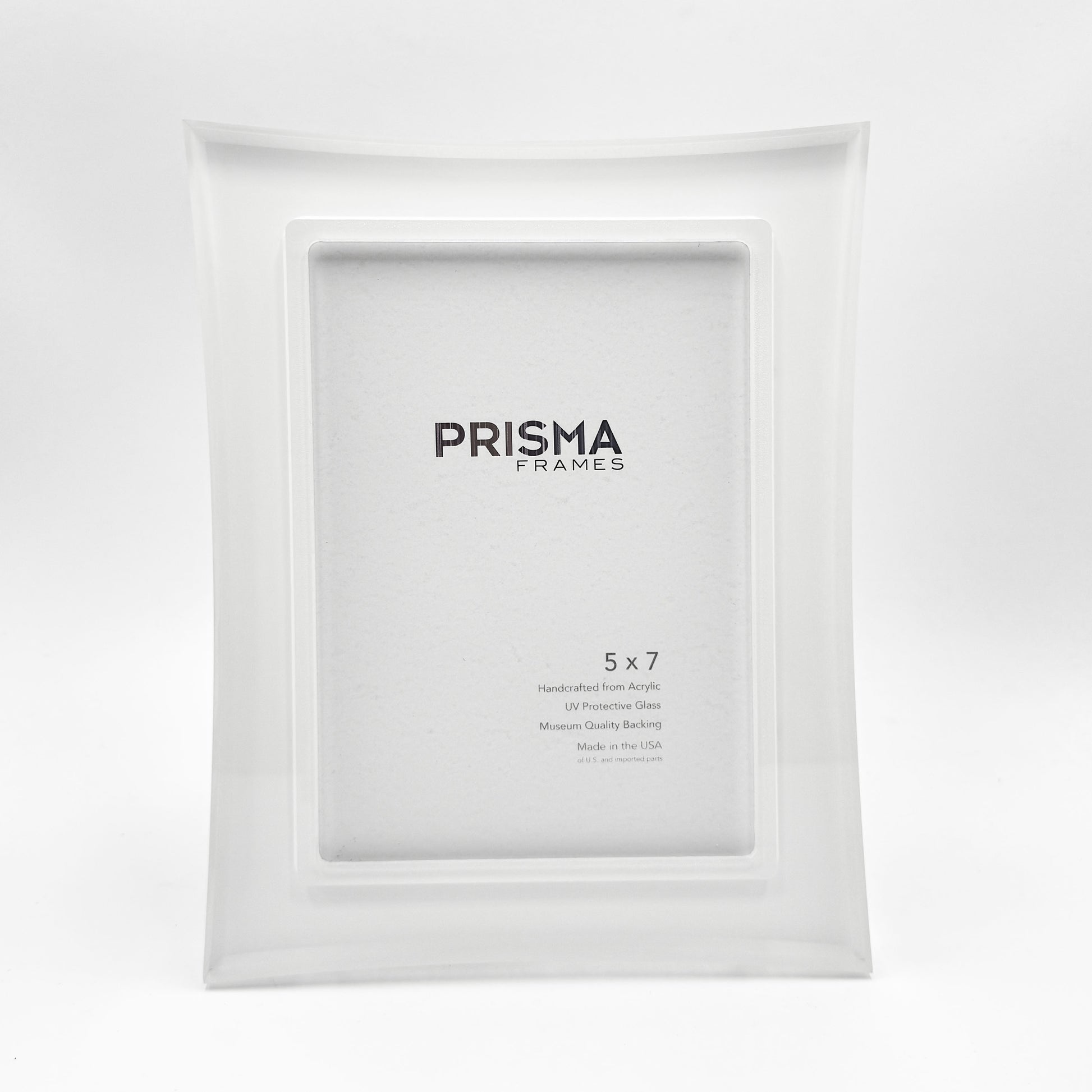- Prisma photo frames are cut by a computer controlled router out of clear solid acrylic, for a contemporary look for your 5"x7" photo or image! The outer edges of the frame are concave, giving the corners a more dramatic flair. The back is painted white so the color shows through the acrylic.
