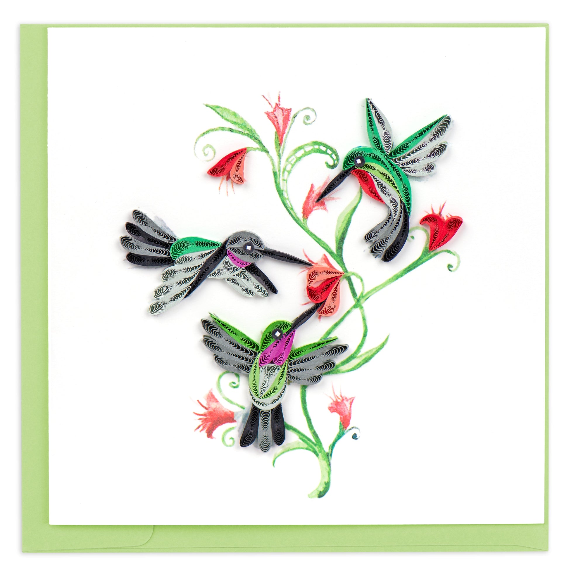 Hand made quilled Hummingbird Trio greeting card. Perfect for the nature lover in your life! The design features three quilled hummingbirds fluttering around an abstract swirling green vine with red flower bulbs.