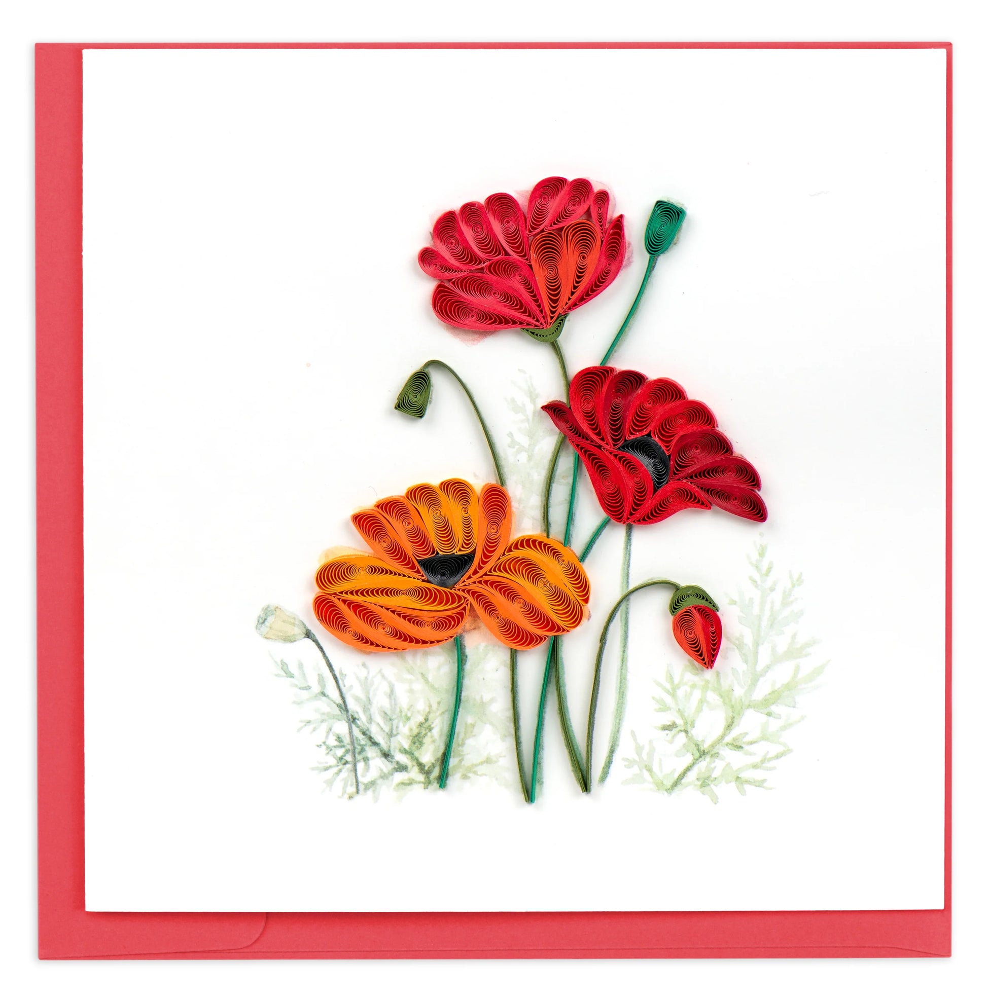 What is not to love with our quilled poppies card. Poppies always held strong symbolism. Red poppies are often used as a remembrance for veterans, for one that bravely served our country. The yellow poppy (also known as the California Poppy) has been known since Victorian times as a symbol of prosperity. This quilled greeting card, features three handcrafted poppies in reds and oranges, these hues, will brighten anyone’s day!