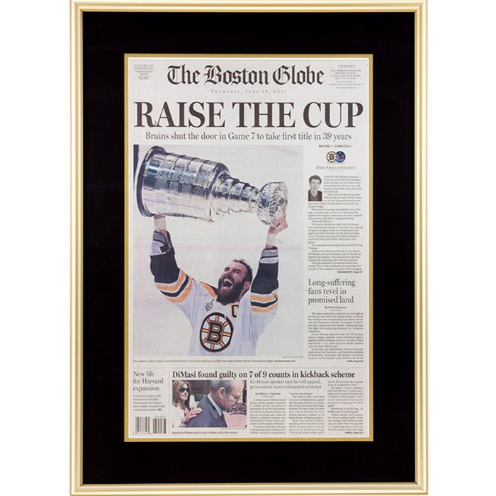 Description: The front cover of the Boston Globe the morning after the Boston Bruins became 2011 Stanley Cup winners. This page features captain Zdeno Chara holding the trophy over his head during the post-game celebration.