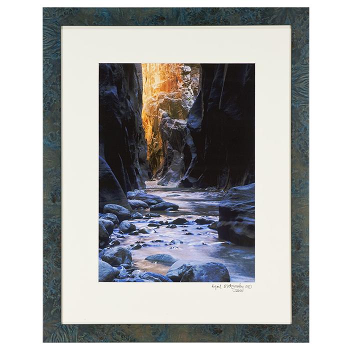 Photograph framed in a 1 1/8" wide blue burl wood frame with U.V. filtering glass and a single acid free mat.