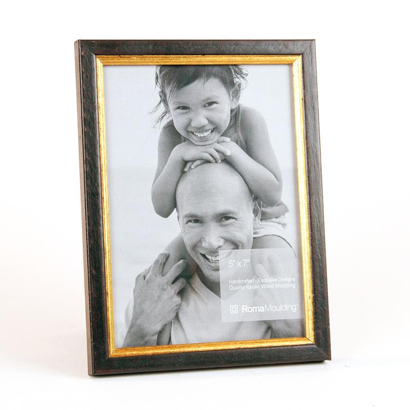 - This ready made frame from the Roma Cortona line is made from solid wood. Its distressd black finish is accented by a rounded, distressed gold inner lip. Frame will fit a 5x7” photo or image.