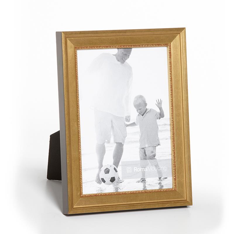 - This ready made frame is from the Roma Eleganza line and is made from solid wood which features an antique gold finish with a raised outer edge and an adornment of small red-rub gold beads along the inner lip. Frame will fit a 5”x7” photo or image.
