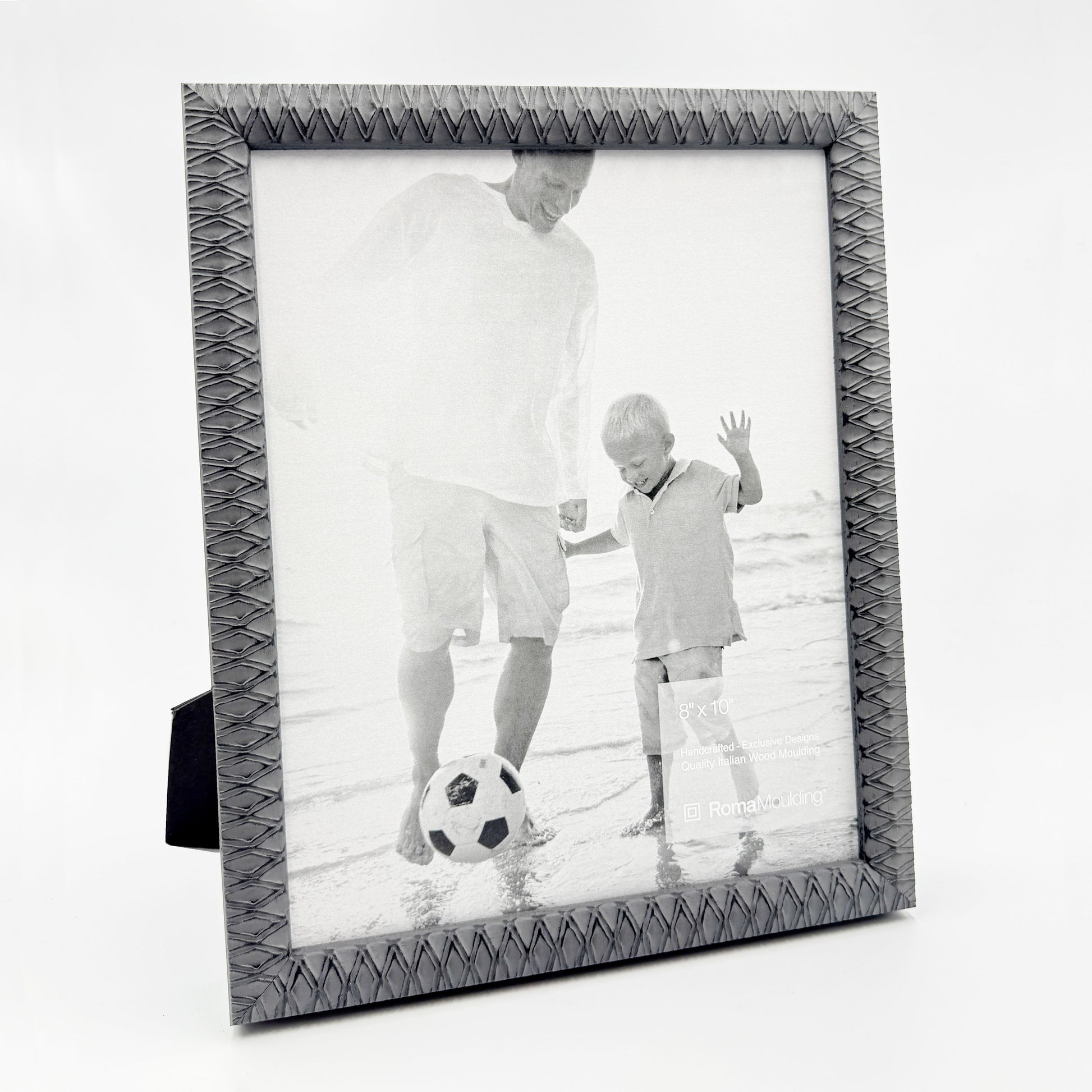 This ready made frame is from the Roma Vintage line and is made from solid wood which features an antique gray and black washed finish with a raised pattern. Frame will fit a 8x10” photo or image.