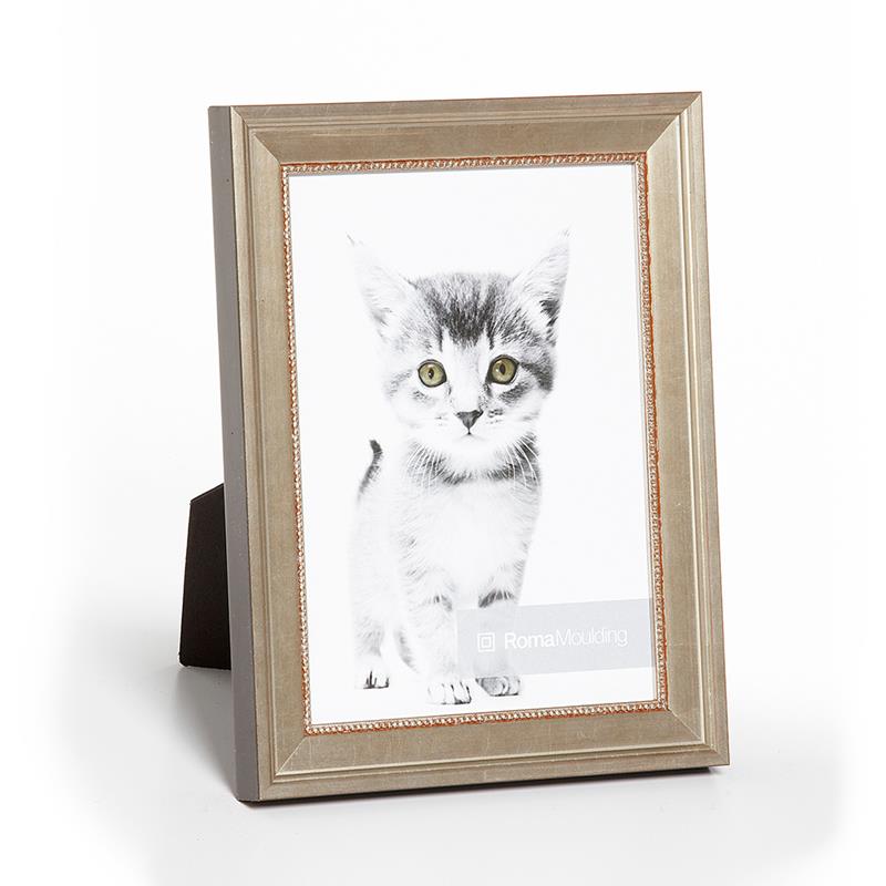 - This ready made frame is from the Roma Eleganza line and is made from solid wood which features an antique silver finish with a raised outer edge and an adornment of small silver beads along the inner lip. Frame will fit a 8”x10” photo or image.