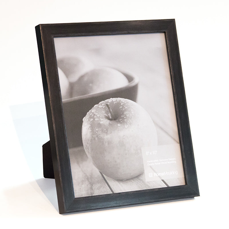 - This solid wood ready made frame is from the Roma Vintage line. The flat face and sides feature a slightly worn, brushed black finish with hints of silver. Frame will fit a 8x10” photo or image.