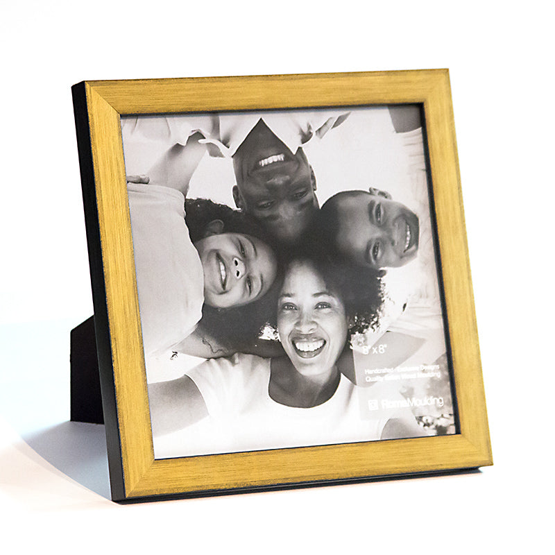 - This solid wood ready made frame is from the Roma Vintage line. The flat face features a slightly worn, brushed gold finish with hints of black. Inside and outside edges are solid black. Frame will fit a 8x8" photo or image.