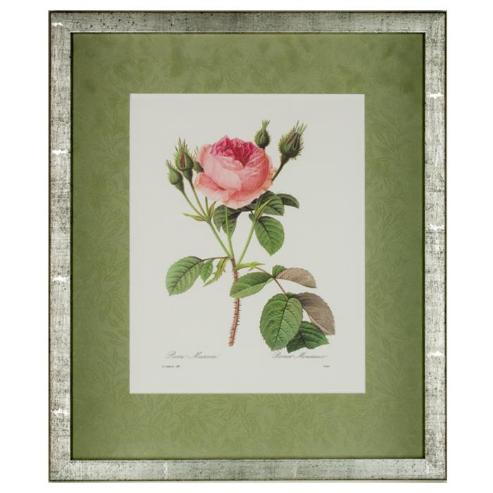 Description: Reproduction of old botanical framed in a 1" wide aged silver wood frame with U.V. filtering glass and a leaf-patterned embossed suede acid free fabric mat.