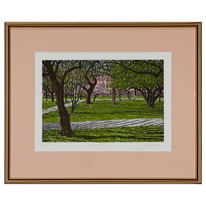 Description: Limited edition hand colored etching framed in a 1/2" wide beaded lip gold wood frame with regular glass and a single acid free mat.
