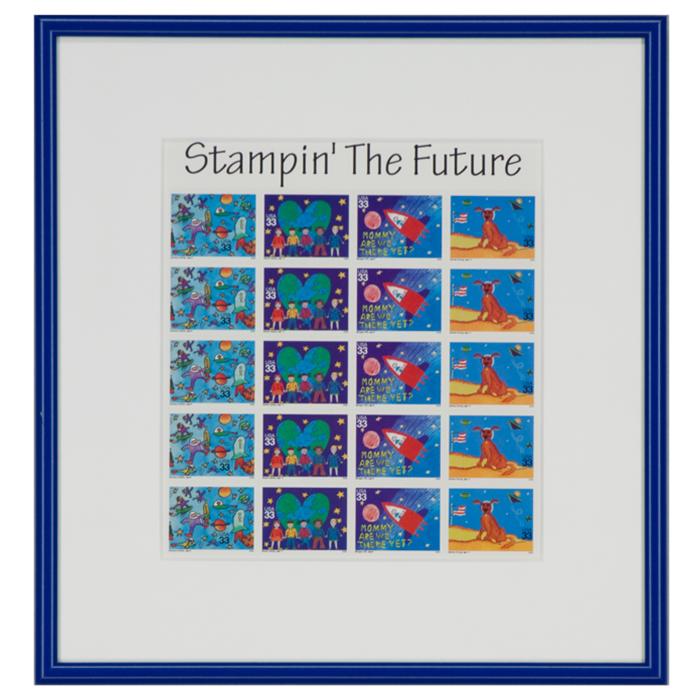 Description: 20 original U.S. postage stamps of children's art about outer space framed in a 3/8" wide blue metal frame with U.V. filtering glass and a single acid free mat.