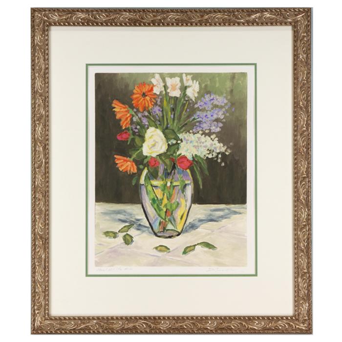 Description: Signed print framed in a 1 1/4" wide stylized antique gold frame with regular glass and double acid free mat.