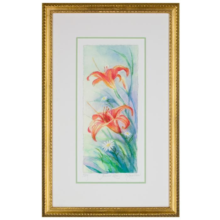 Description: Limited edition hand colored etching framed in 7/8" wide traditional gold wood frame with U.V. filtering glass and a double acid free mat.