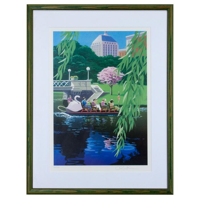 Limited edition offset lithograph print (611/1500) framed in a 1" wide green painted wood to highlight the wood grain. Framing also includes U.V. Filtering glass and has an acid free mat.