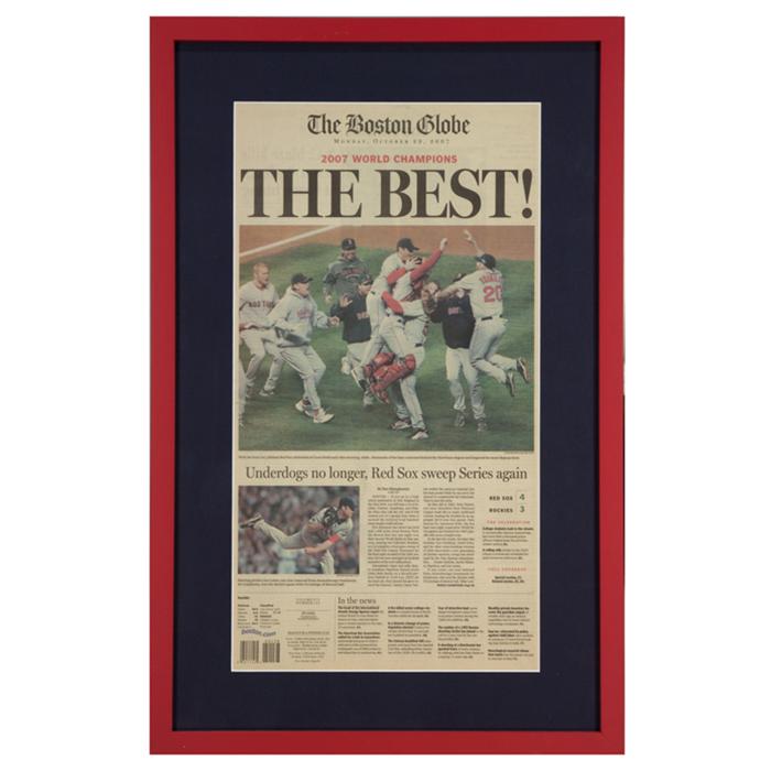 Original newspaper from Red Sox win of 2007 World Series framed in a 7/8" wide red painted wood frame with U.V. filtering glass and a single acid free mat.