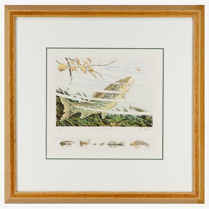 Limited edition hand-colored etching (262/350) framed in a 1 1/8" wide reverse slope oak frame with regular glass and an acid free double mat.