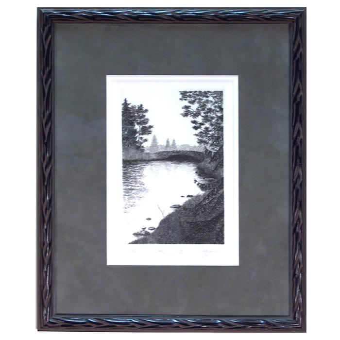 Limited edition etching framed in a 7/8" wide carved black frame with U.V. filtering glass and a single suede mat.