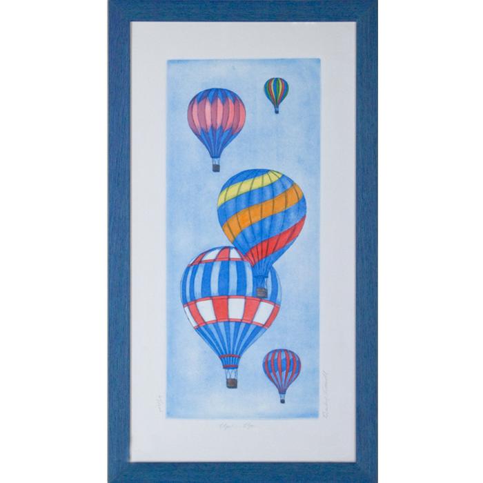 Description: Limited edition 61/1200 hand colored etching. Art is framed in a 1" wide grained blue wood frame. Frame also includes U.V. filtering glass for protection.