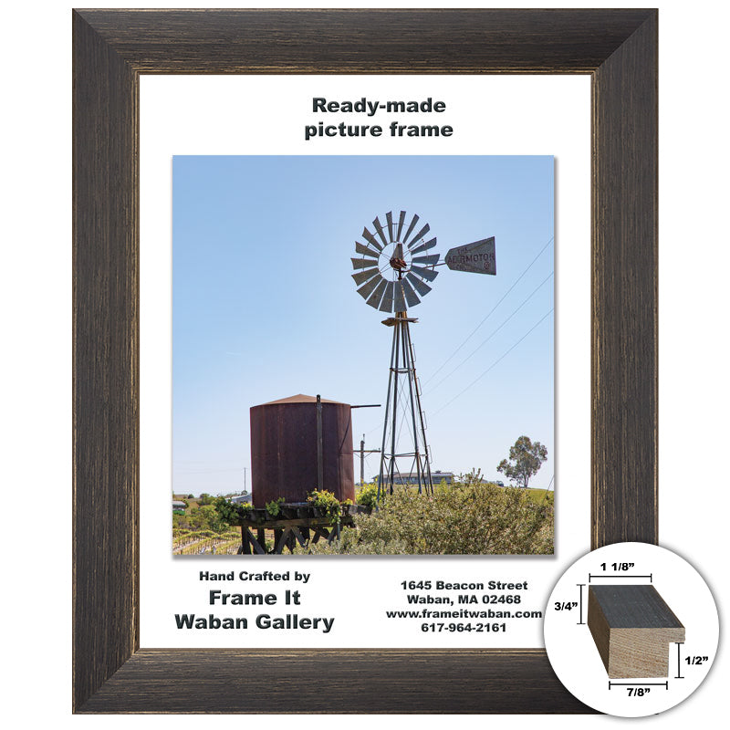 - This is one of the ready-made picture frames we make here at Frame It / Waban Gallery. Our 11x14” picture frame is made out of solid real wood and features a flat profile and a distressed black finish with a hint of gold along the inner lip. The frame moulding is finished with hand-applied gold leaf for a rich look and feel. This ready made gold 11x14” picture frame works great with artwork or photos.