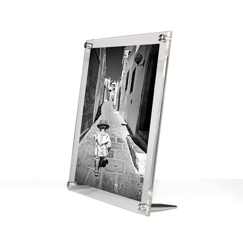 - Stunning, Diamond polished beveled edge acrylic tabletop frame. Choose between floating 4x6" or 5x7" photos. Stands vertically or horizontally.