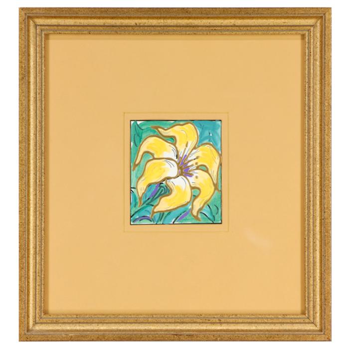 Description: Original acrylic and paint marker image framed in 1" wide stepped antique gold frame with gray lines with regular glass. Art is floated on mat board then matted around with a gold edged mat.