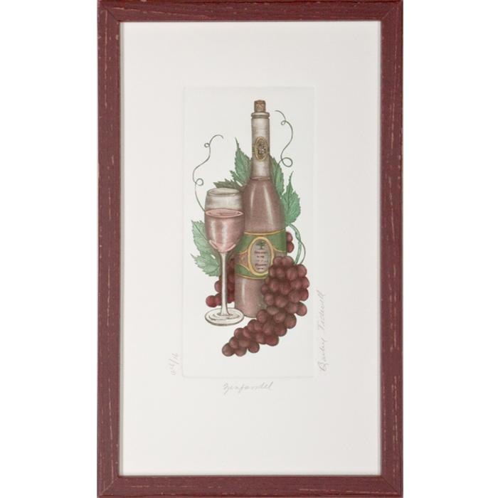 Limited edition 91/750 hand colored etching showing a bottle of zinfandel, a wine glass and grapes. Art is framed in a 5/8" wide aged painted burgundy wood frame. Frame also includes U.V. filtering glass
